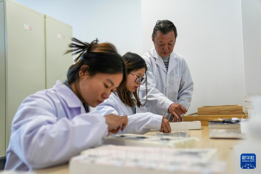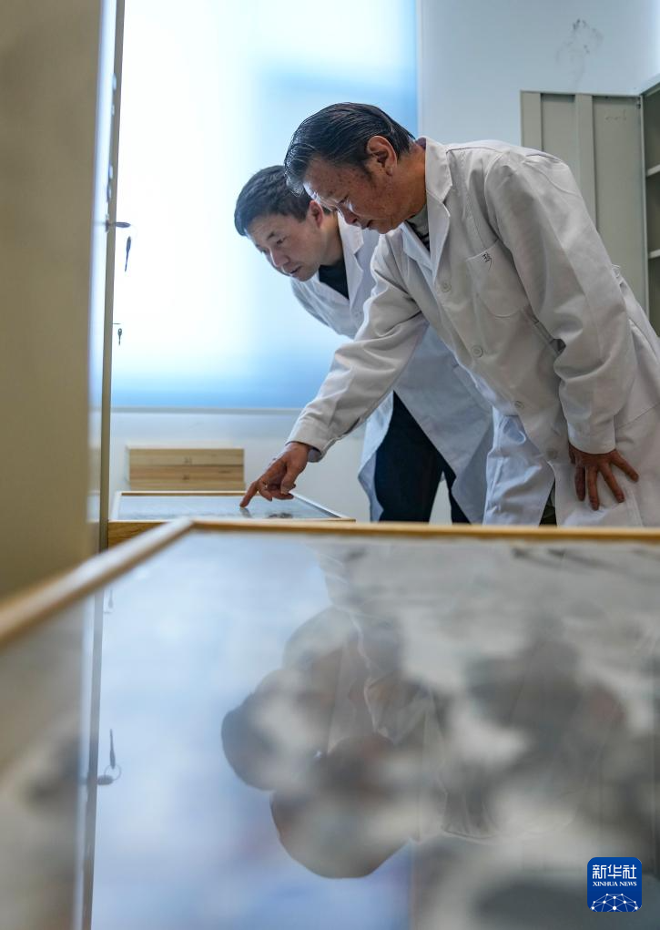 在位於(yu) 拉薩的西藏自治區高原生物研究所,達娃(右)和同事查看采集到的昆蟲標本(4月22日攝)。新華社記者 晉美多吉 攝