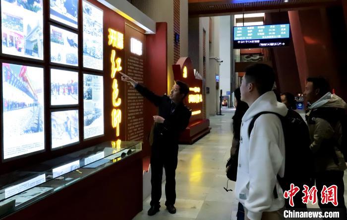 拉薩車站客運運轉車間主任候占元帶領候車旅客參觀車站的愛國主義(yi) 教育基地文化長廊。旅客們(men) 在這裏聆聽了青藏鐵路發展史、青藏鐵路人的奮鬥故事。