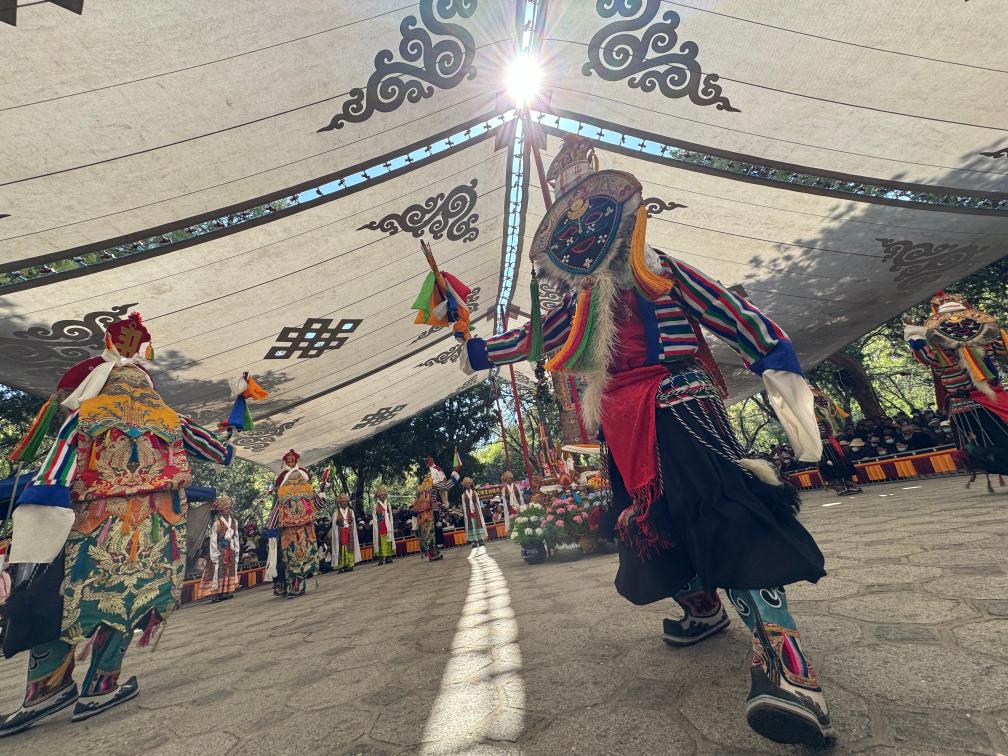廣場中央戲台上,鼓點輕快、鈸聲鏗鏘,戴著黃麵白發麵具的藏戲演員唱腔高亢激昂;台下,觀眾(zhong) 聚精會(hui) 神,不時隨著演員表演一起大笑。