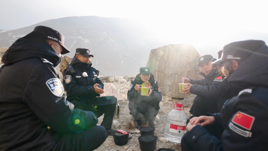 經過4個(ge) 多小時的高海拔行走,巡邊隊伍終於(yu) 到達了6000米的巡邏折返點位,也到了巡邏路上的快樂(le) 時刻,吃火鍋!“現在後勤保障到位,無論在野外何處,吃頓熱飯已不是難事”,帶隊的副所長次仁加措說道。