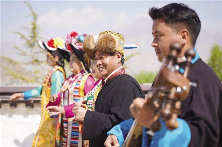 早上8點半,拉薩市民德央帶著從(cong) 雲(yun) 南過來的朋友吳女士來到羅布林卡。當日,來自8家文博單位的專(zhuan) 家現場講述了15件珍貴文物背後的故事。幾位專(zhuan) 家輪流講解著,大家在底下認真聆聽。“這個(ge) 文博大講堂讓我了解到這些文物背後的故事,意識到了民族文化交往交流交融的重要性。這是我第一次沉浸式體(ti) 驗西藏文化,是離西藏文化最近的一次。”吳女士說。咚咚咚……此時,羅布林卡一角,鼓聲響起。這是拉薩市城關(guan) 區娘熱民間藝術團正為(wei) 觀眾(zhong) 們(men) 演繹著傳(chuan) 統藏戲。