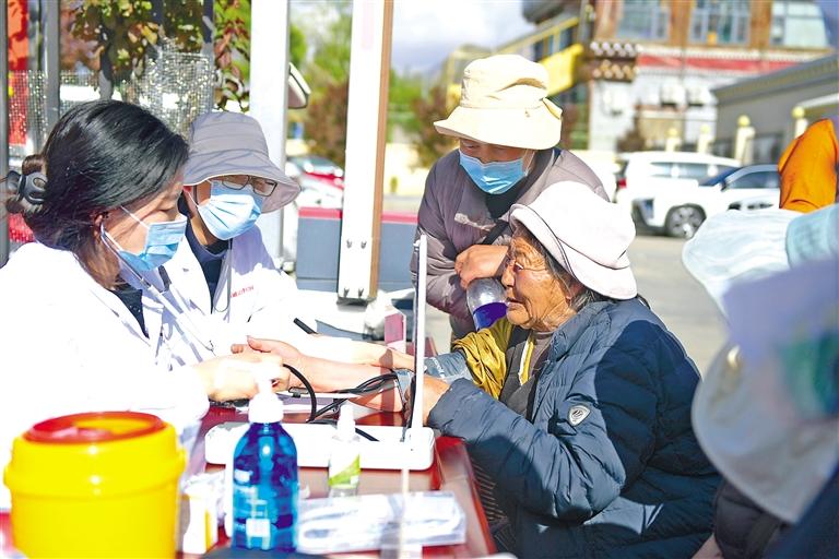 上圖:5月11日,西藏司法警官醫院聯合拉薩市城關(guan) 區紮細社區黨(dang) 支部在轄區開展義(yi) 診活動,為(wei) 市民群眾(zhong) 免費檢查身體(ti) ,普及健康知識。 本報記者 潘多 攝
