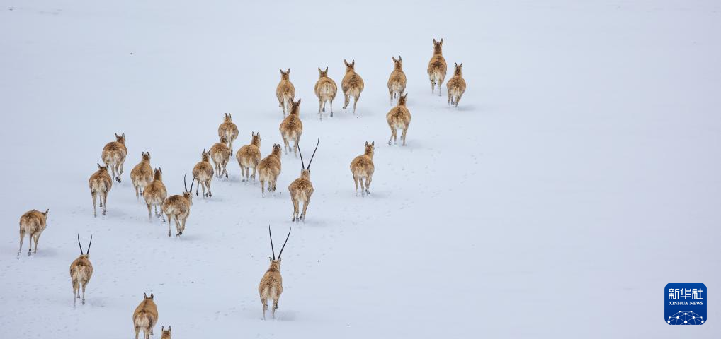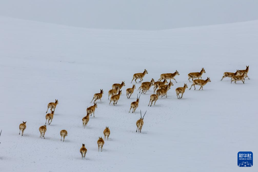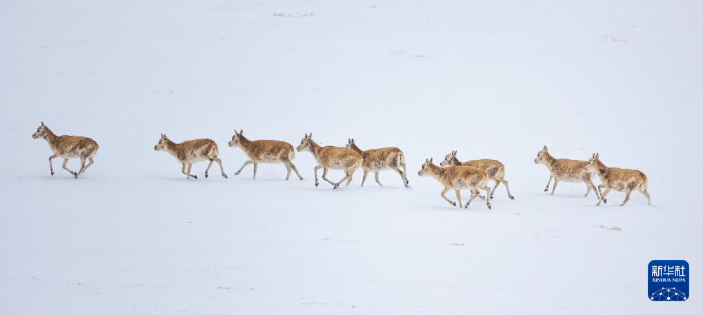 藏羚羊在雪地上奔跑(5月8日攝)。新華社記者 薑帆 攝