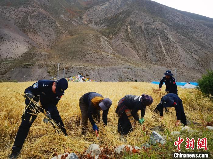 圖為(wei) 貢當邊境派出所民警幫助當地農(nong) 民秋收。日喀則邊境管理支隊供圖