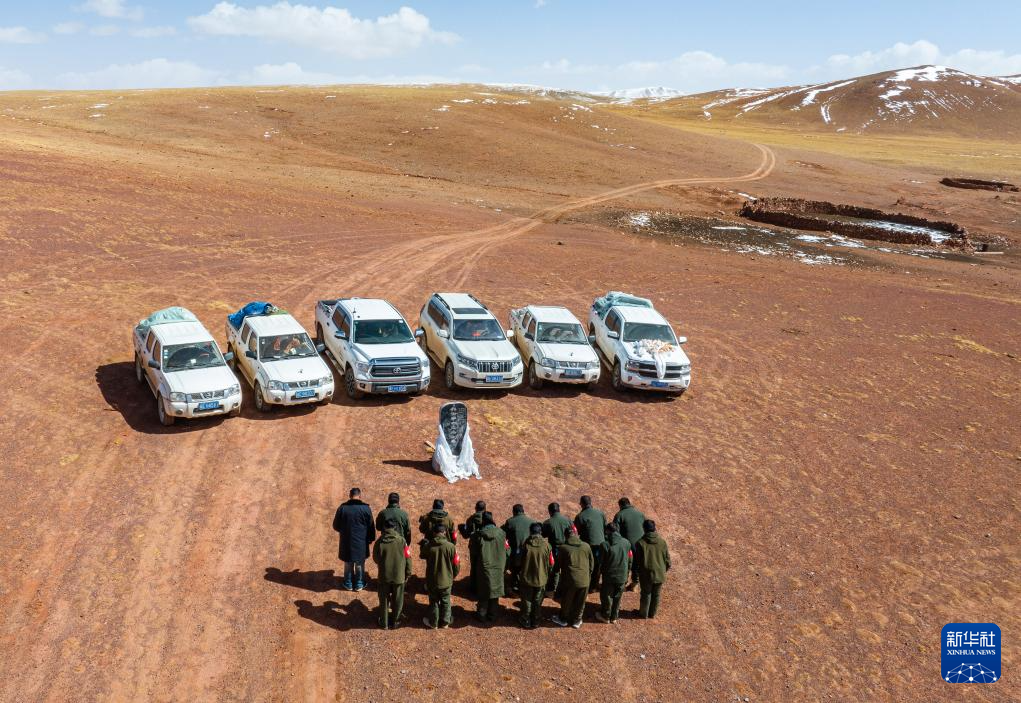 野生動物專(zhuan) 業(ye) 管護隊員在無人區深處的羅布玉傑烈士紀念碑前默哀致敬。羅布玉傑2002年在與(yu) 盜獵分子的槍戰中犧牲(無人機照片,5月10日攝)。新華社記者 薑帆 攝