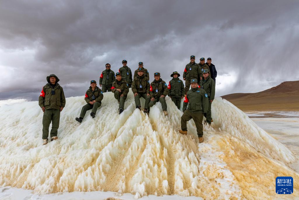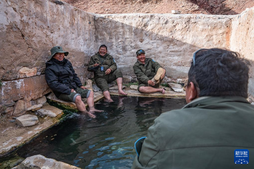 野生動物專(zhuan) 業(ye) 管護隊員們(men) 在一處廢棄的溫泉池中泡腳休息(5月8日攝)。新華社記者 丁增尼達 攝