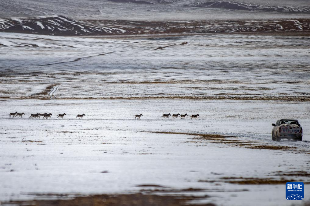 成群的藏野驢從(cong) 野生動物專(zhuan) 業(ye) 管護隊員們(men) 的車前跑過(5月9日攝)。新華社記者 薑帆 攝