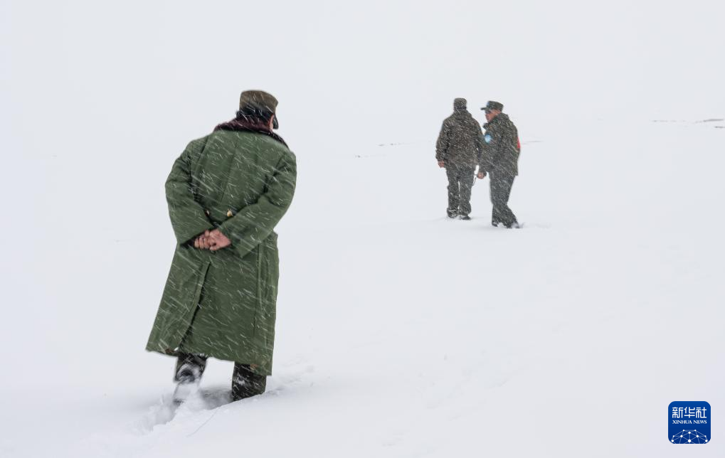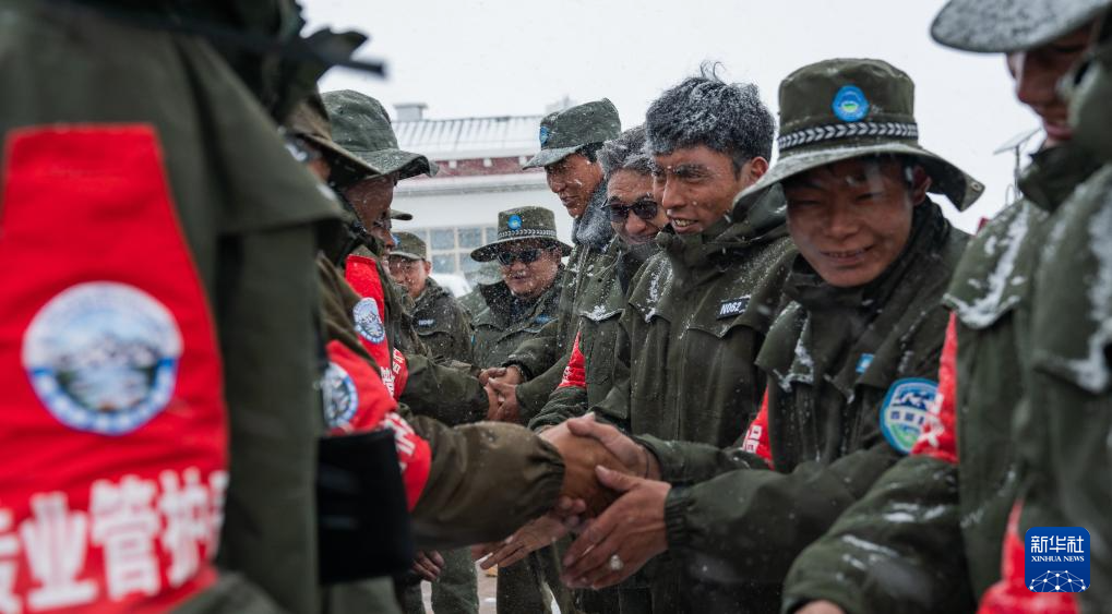 布查玉管護站的野生動物管護隊員們(men) 熱情歡迎風雪中前來巡護的同事(5月7日攝)。新華社記者 丁增尼達 攝