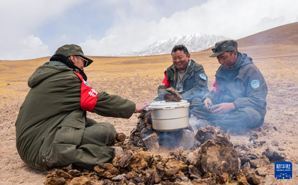 野生動物專(zhuan) 業(ye) 管護隊員在巡護途中就地取材,用野犛牛糞生火做飯(5月10日攝)。新華社記者 丁增尼達 攝