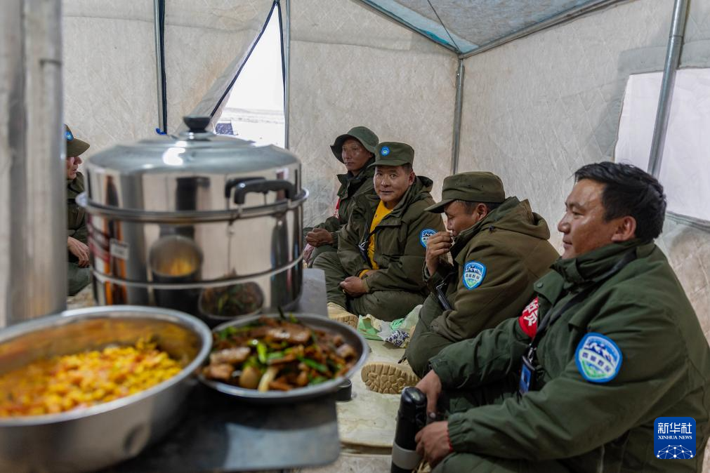 野生動物專(zhuan) 業(ye) 管護隊員們(men) 在宿營的帳篷中準備吃飯(5月7日攝)。新華社記者 薑帆 攝