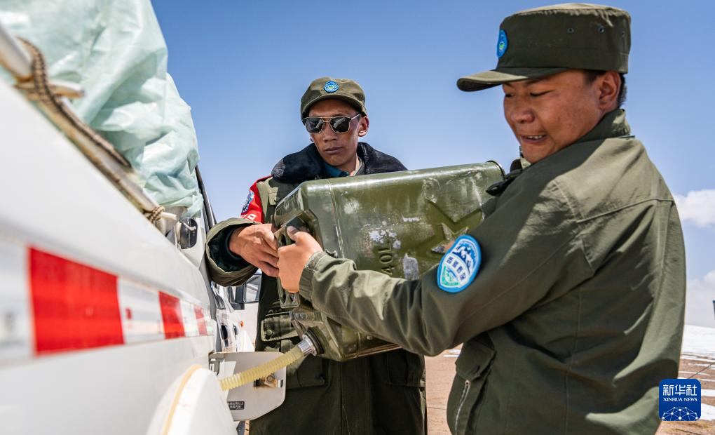 野生動物專(zhuan) 業(ye) 管護隊員在巡護途中給車輛加油(5月9日攝)。新華社記者 丁增尼達 攝