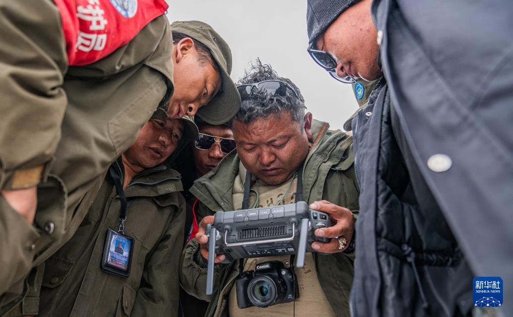 羅布玉傑管護站站長格桑倫(lun) 珠(右二)和隊員們(men) 在大雪中操作無人機觀察藏羚羊遷徙情況(5月10日攝)。新華社記者 丁增尼達 攝