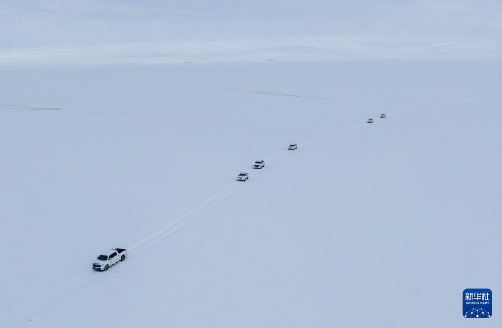 野生動物專(zhuan) 業(ye) 管護隊員的車隊在大雪中巡護(無人機照片,5月8日攝)。新華社記者 丁增尼達 攝