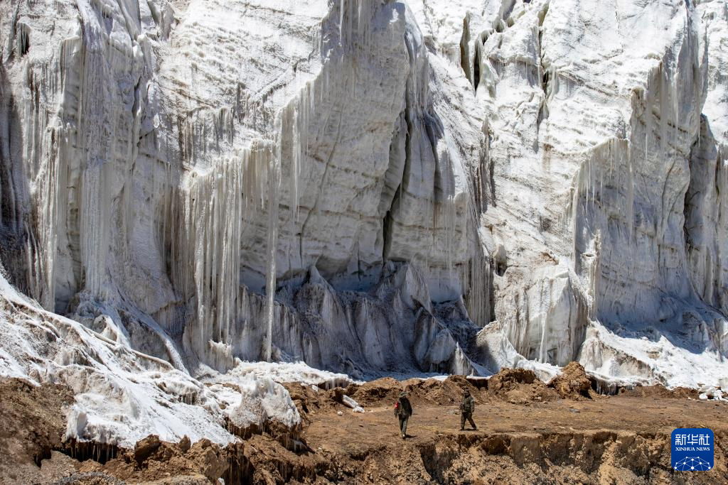 野生動物專(zhuan) 業(ye) 管護隊員在無人區深處的藏色崗日冰川巡查(5月11日攝)。新華社記者 薑帆 攝