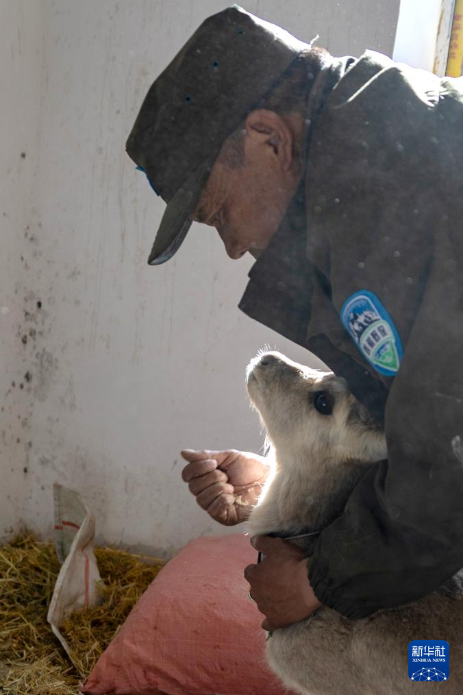 羅布玉傑站的野生動物專(zhuan) 業(ye) 管護隊員在出發巡護前給站裏救護的受傷(shang) 藏原羚喂糌粑(5月7日攝)。新華社記者 薑帆 攝