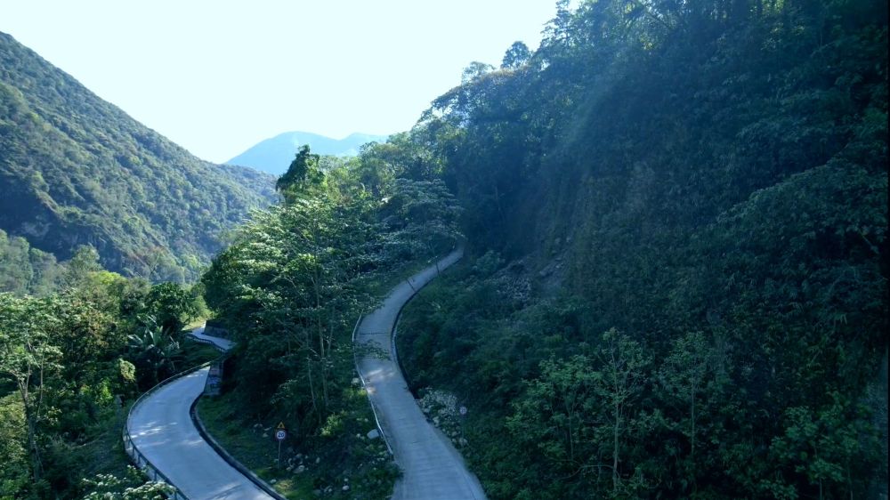 茶場道路順著山穀延伸,像一條絲(si) 帶纏繞在翠綠的山上,與(yu) 國道559線紮墨段(即