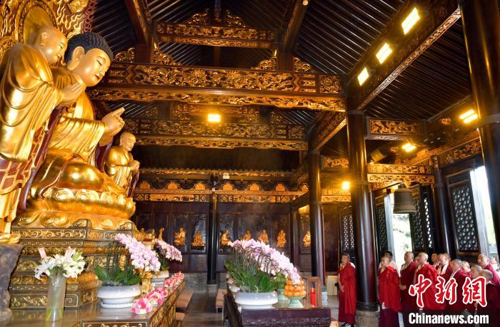 參觀結束後,少年活佛們(men) 返回主殿,在釋迦牟尼佛像前敬獻哈達,同寬嚴(yan) 法師一起誦經,共同祈願國泰民安、世界和平。