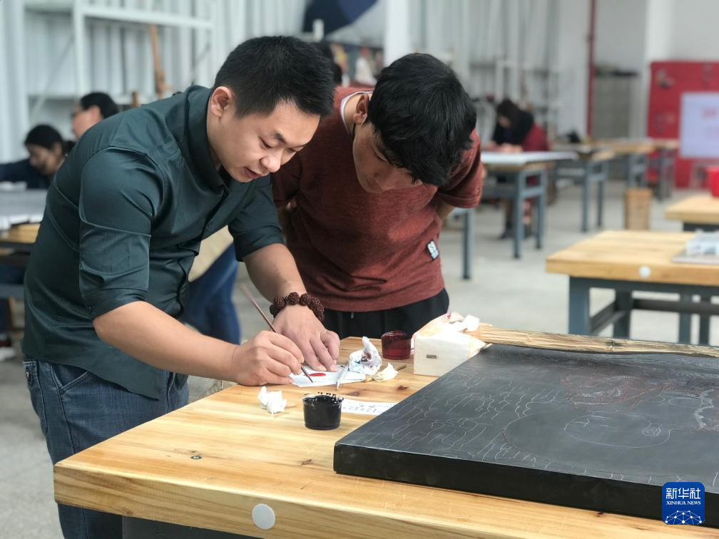2018年,仁青郎加(右)正跟老師學習(xi) 漆畫技法。新華社發