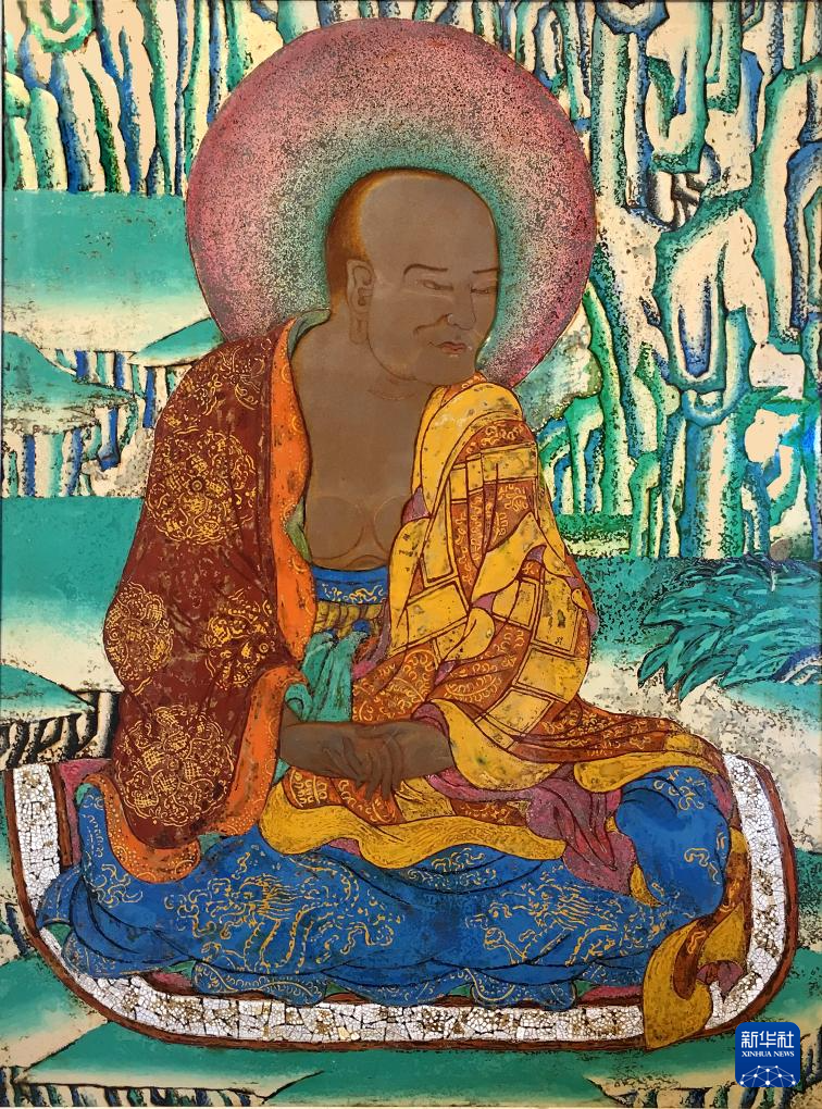 仁青郎加的第一幅唐卡漆畫作品——《指小路尊者》。新華社發