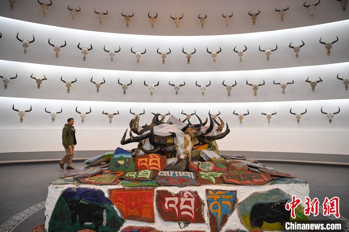 圖為(wei) 西藏犛牛博物館感恩展廳內(nei) ,牆上懸掛的犛牛頭骨。 中新社記者 貢嘎來鬆 攝