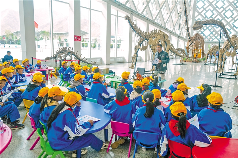5月18日,在西藏自然科學博物館內(nei) ,工作人員向拉薩市第三小學的學生講述西藏的自然曆史。記者 丹增群培 攝