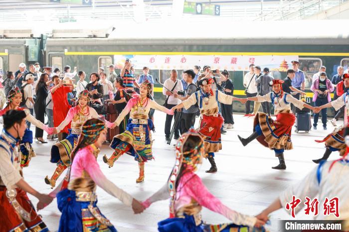 發車儀(yi) 式上,大型藏族舞蹈表演歡迎遊客乘車。記者 賈天勇 攝