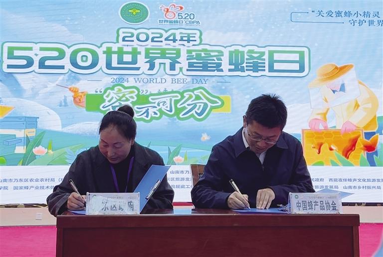 中國蜂產(chan) 品協會(hui) 領導與(yu) 乃東(dong) 區政府副區長宗巴(左)簽署共建“西藏山花蜂蜜之鄉(xiang) ”協議。記者 旦增玉珍 攝