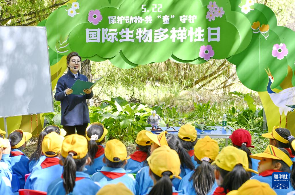 5月22日,拉魯濕地國家級自然保護區管理局局長拉姆次仁在活動中邀請小學生做“小小宣講員”和“拉魯濕地小衛士”。新華社記者 張汝鋒 攝