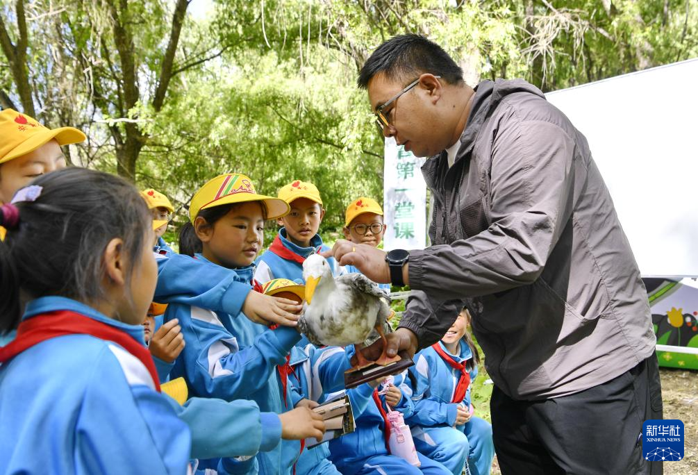 5月22日,西藏大學生態環境學院助理實驗師朱文璡向小學生展示鳥類標本。新華社記者 張汝鋒 攝
