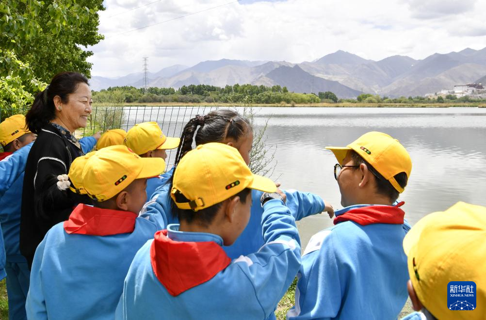 5月22日,拉魯小學師生一起觀賞拉魯濕地美景。新華社記者 張汝鋒 攝