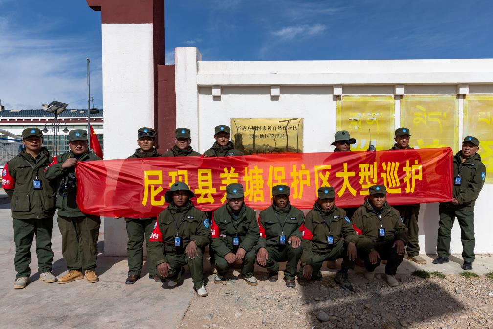 野生動物專(zhuan) 業(ye) 管護隊員出發巡護前在尼瑪縣縣城的羅布玉傑管護站合影(5月7日攝)。新華社記者 薑帆 攝
