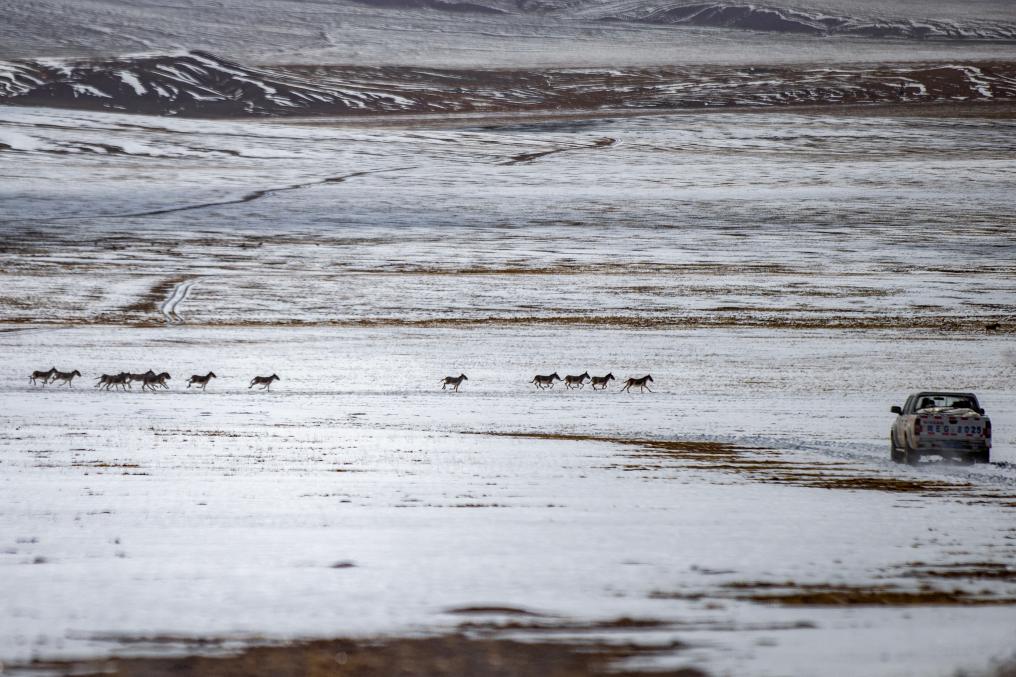 成群的藏野驢從(cong) 野生動物專(zhuan) 業(ye) 管護隊員們(men) 的車前跑過(5月9日攝)。新華社記者 薑帆 攝