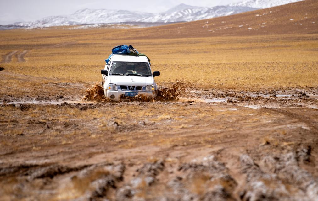 野生動物專(zhuan) 業(ye) 管護隊員的車子在巡護路上穿越泥濘(5月10日攝)。新華社記者 薑帆 攝