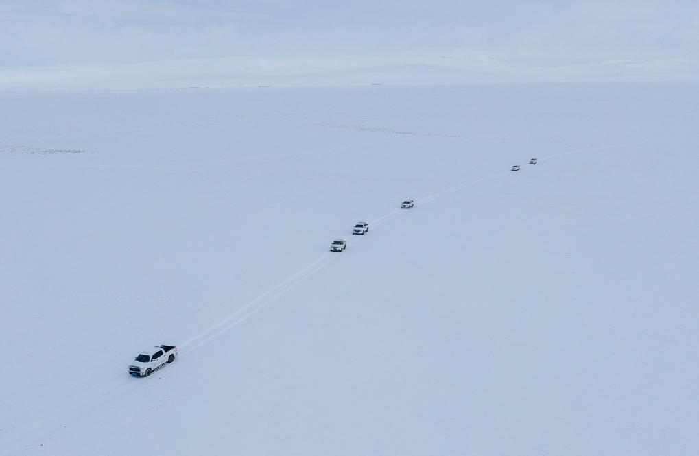 野生動物專(zhuan) 業(ye) 管護隊員的車隊在大雪中巡護(無人機照片,5月8日攝)。新華社記者 丁增尼達 攝