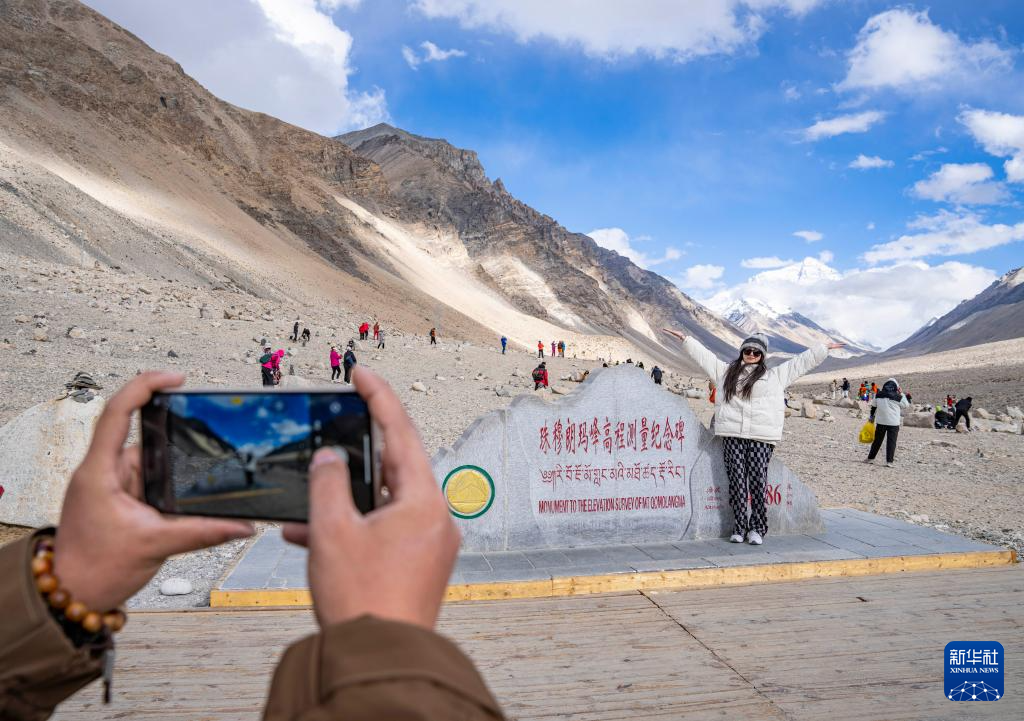 遊客在珠穆朗瑪峰高程測量紀念碑前拍照留念(5月24日攝)。