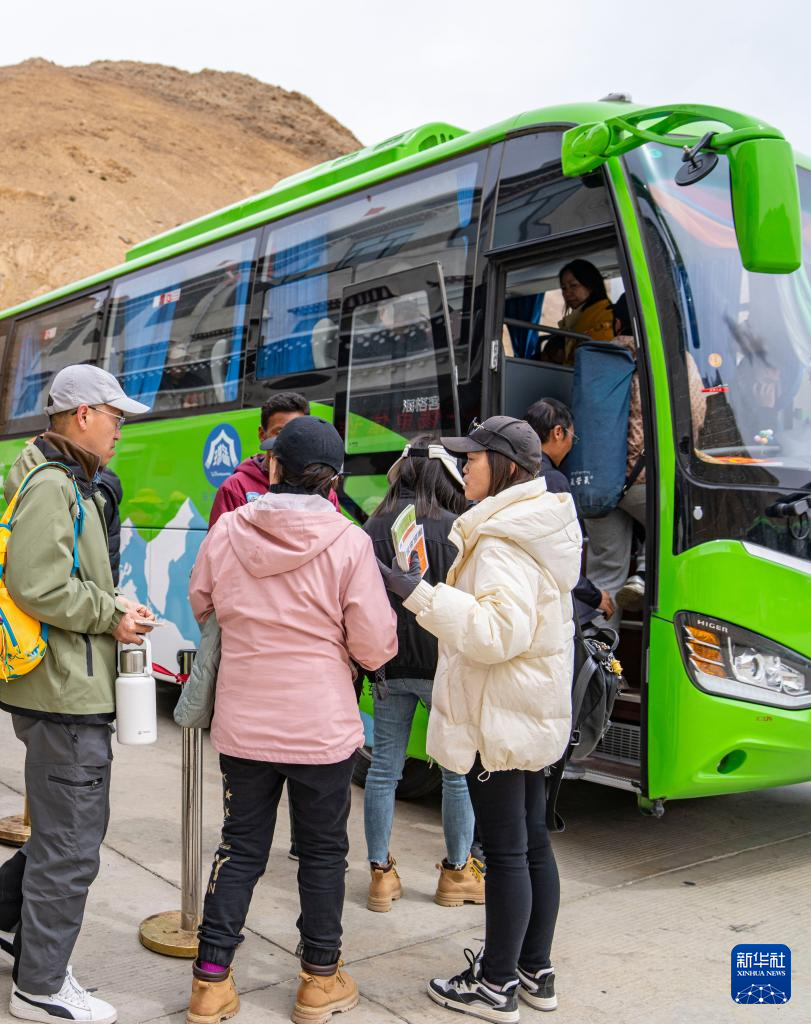遊客在珠穆朗瑪國家公園內(nei) 排隊換乘環保大巴車(5月20日攝)。