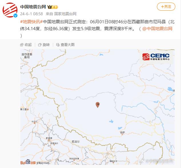 中國地震台網正式測定:06月01日08時46分在西藏那曲市尼瑪縣(北緯34.14度,東(dong) 經86.36度)發生5.9級地震,震源深度8千米。