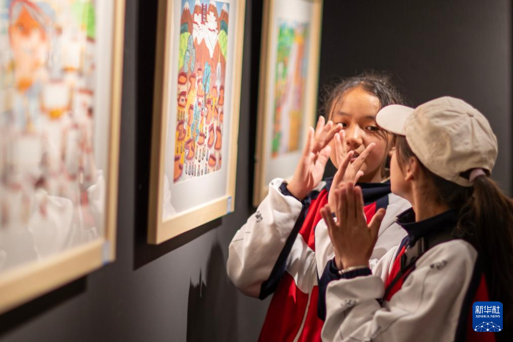 6月5日,拉薩市特殊教育學校的孩子在參觀作品展覽時用手語交流。新華社記者 薑帆 攝