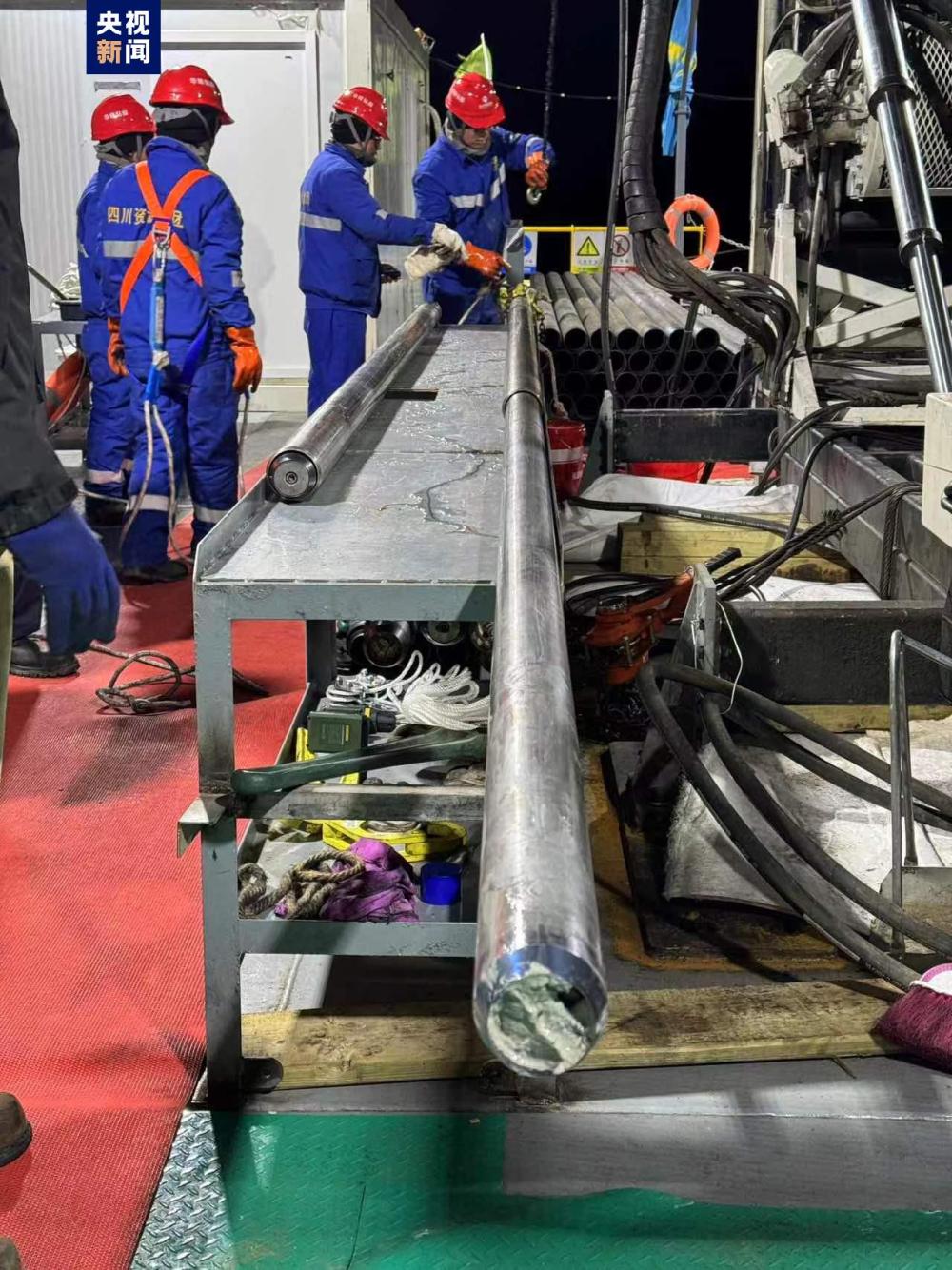 6月6日作為(wei) 鑽芯的第一天,經過不斷地調整和試驗,當晚23時20分,第一次正式鑽探開始,鑽頭深入到了水下95米左右的位置,在第一個(ge) 點位開始鑽取湖泊岩芯。23時40分,科考團隊獲得了第一批湖泊岩心樣本。科研團隊每次鑽取3米一段,通過24小時輪班不間斷作業(ye) ,截至7日早6時,已獲得9米長的岩芯。