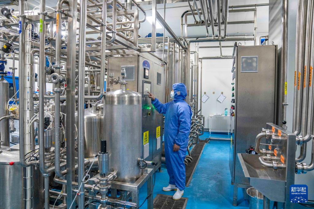 在聶榮縣嘎確生態畜牧業(ye) 發展有限責任公司,工人在進行灌裝前的機械殺菌處理(5月13日攝)。新華社記者 孫非 攝