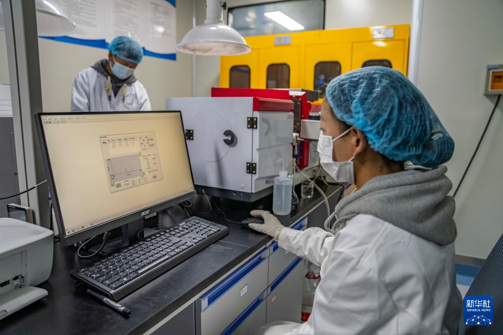 在聶榮縣嘎確生態畜牧業(ye) 發展有限責任公司,檢驗員達娃卓瑪在檢測奶製品(5月13日攝)。新華社記者 孫非 攝
