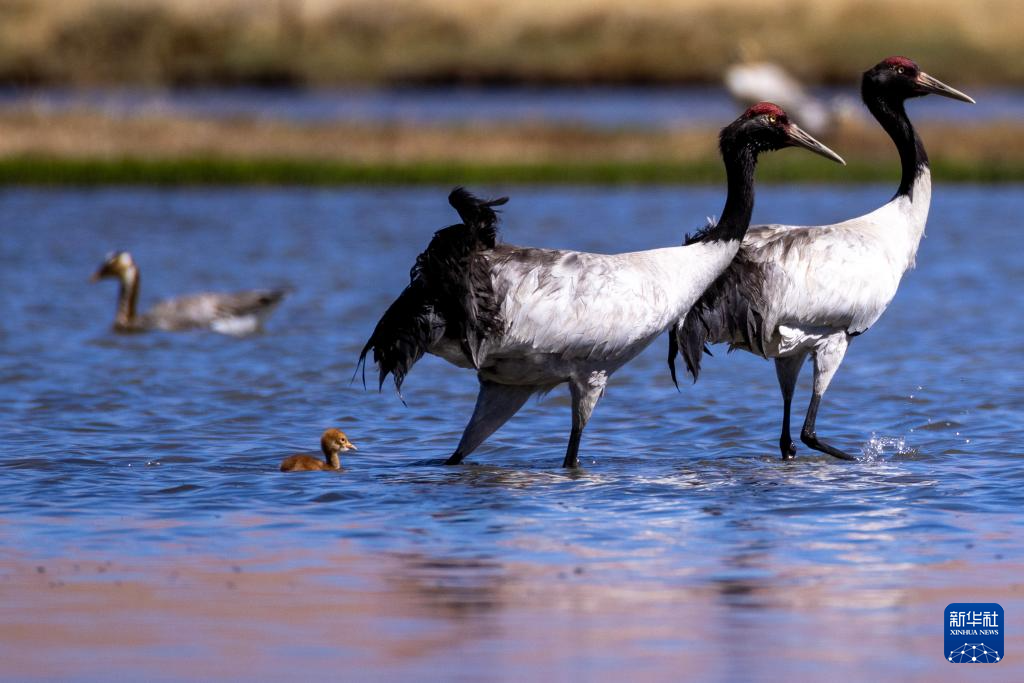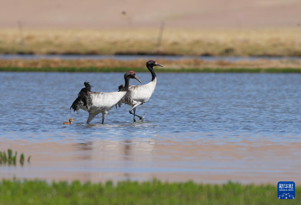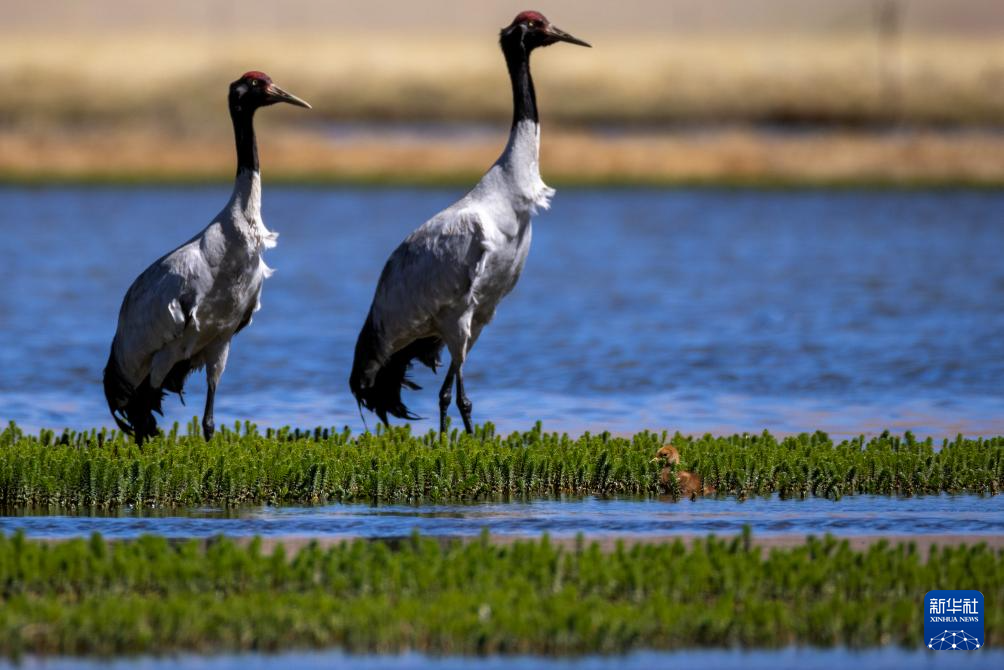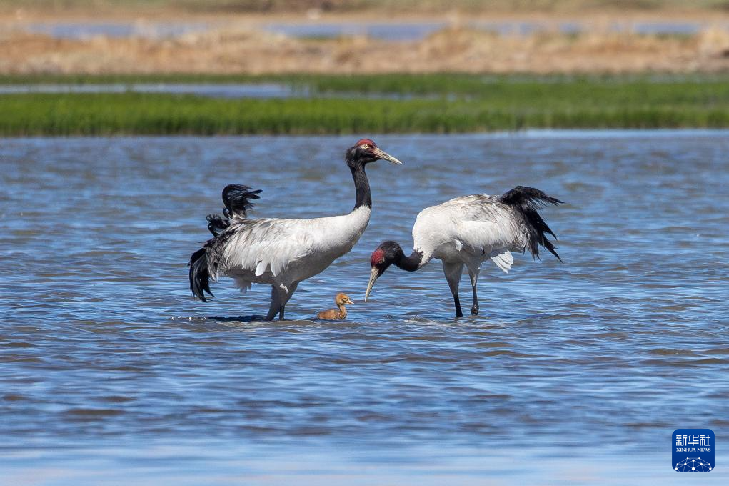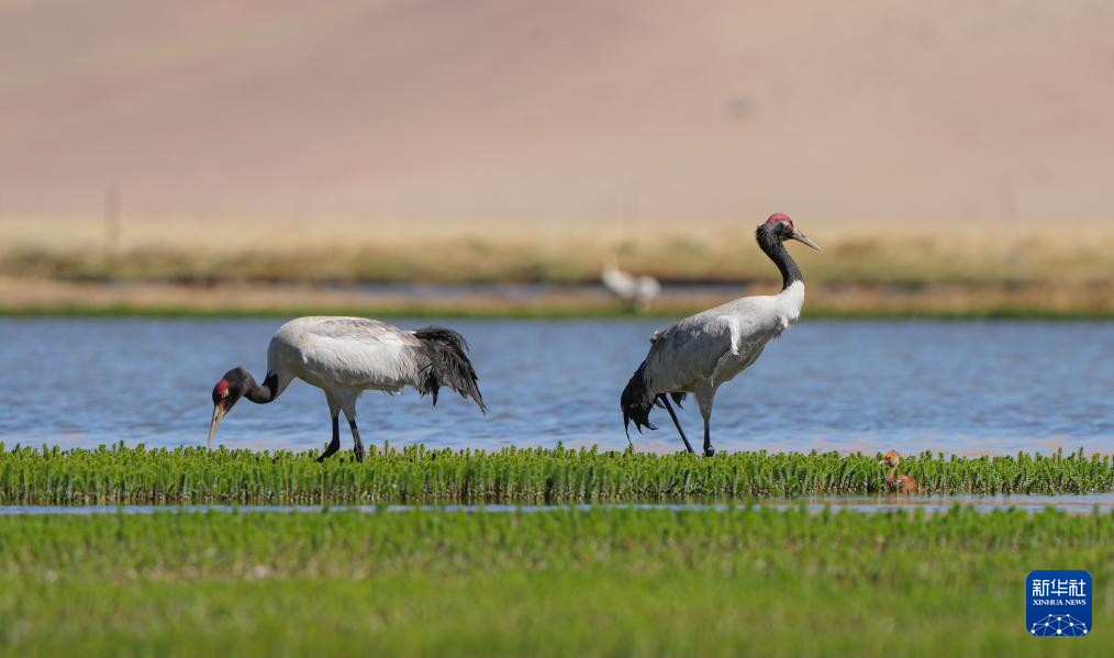 6月9日,一對黑頸鶴夫婦帶著雛鳥在西藏那曲市申紮縣一處濕地棲息、覓食。新華社記者 薑帆 攝