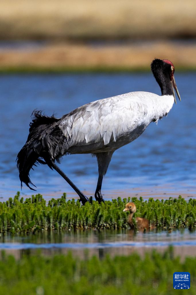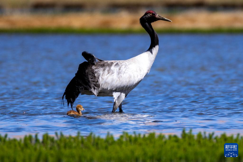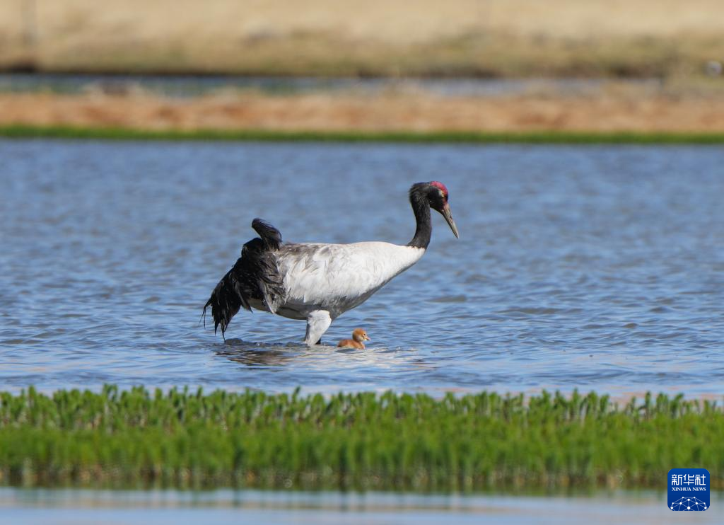 6月9日,黑頸鶴帶著雛鳥在西藏那曲市申紮縣一處濕地棲息、覓食。新華社記者 薑帆 攝