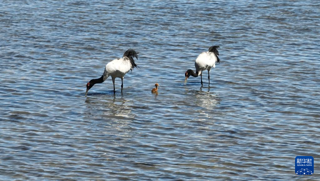 6月9日,一對黑頸鶴夫婦帶著雛鳥在西藏那曲市申紮縣一處濕地棲息、覓食。新華社記者 晉美多吉 攝