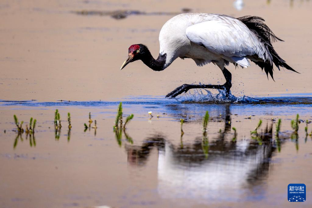 6月9日,一隻黑頸鶴在西藏那曲市申紮縣一處濕地棲息、覓食。新華社記者 薑帆 攝