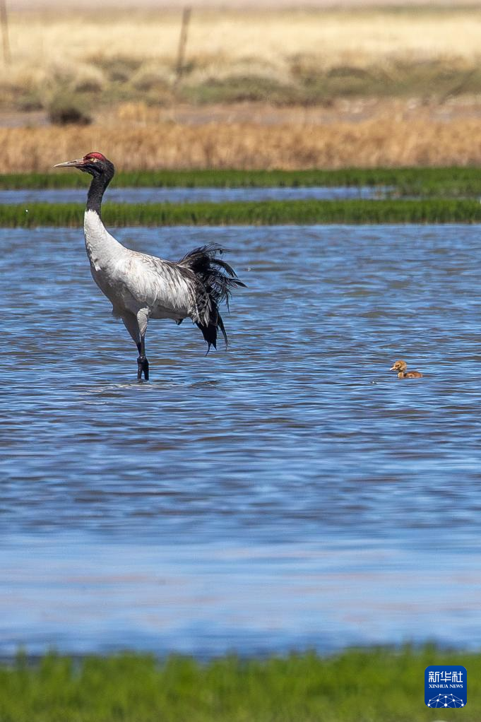 6月9日,黑頸鶴帶著雛鳥在西藏那曲市申紮縣一處濕地棲息、覓食。新華社記者 晉美多吉 攝
