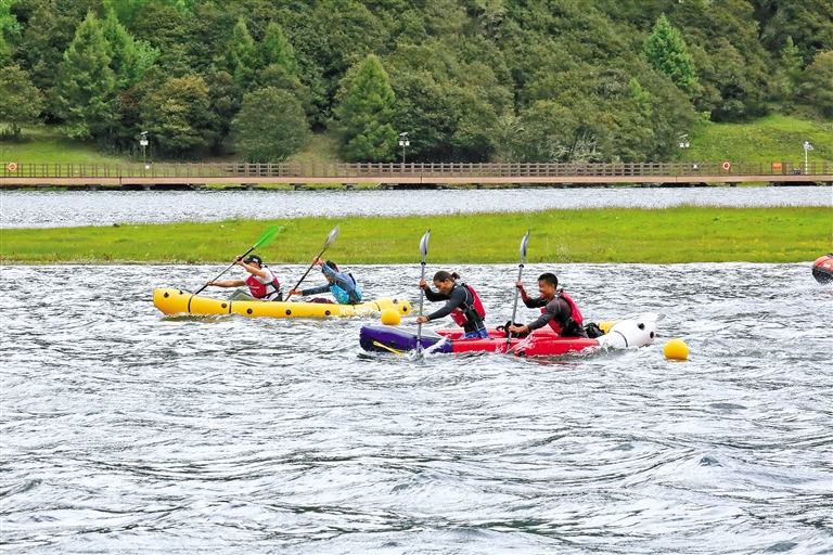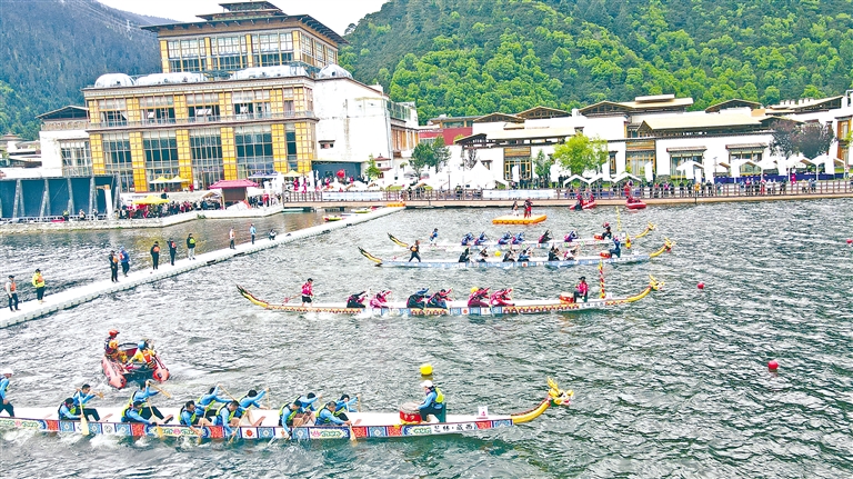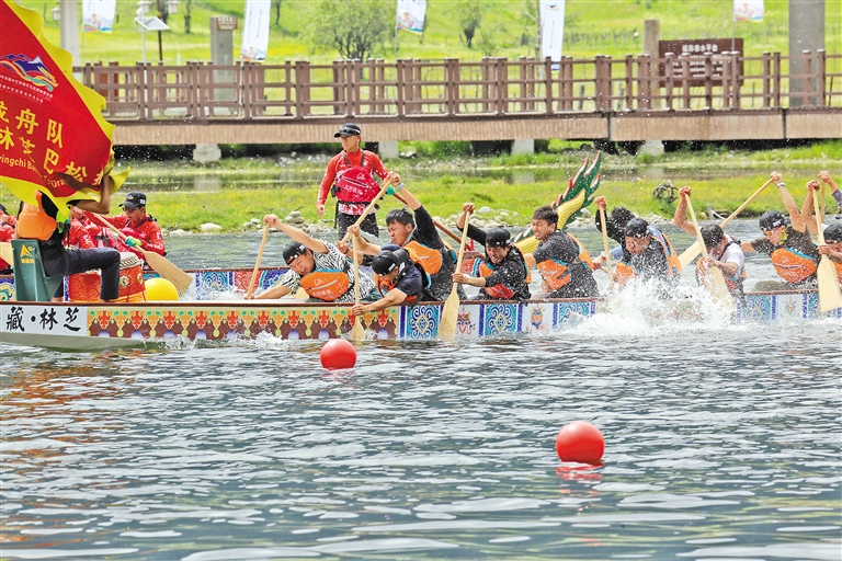 6月10日,2024年西藏林芝南迦巴瓦高原體(ti) 育大會(hui) 魯朗中尼高原龍舟友誼賽精彩上演。來自尼泊爾、新加坡和北京市、雲(yun) 南省以及拉薩市、林芝市等多地的8支龍舟隊,百餘(yu) 名運動員奮力揮槳、激流勇進,為(wei) 廣大群眾(zhong) 和遊客獻上了一場水上競技的“大餐”。