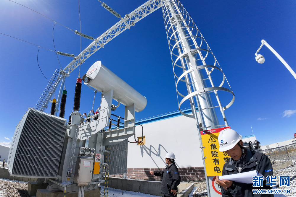 工作人員在110千伏協合措美縣20兆瓦MW並網光伏電站進行日常檢查。新華網 旦增努布 攝
