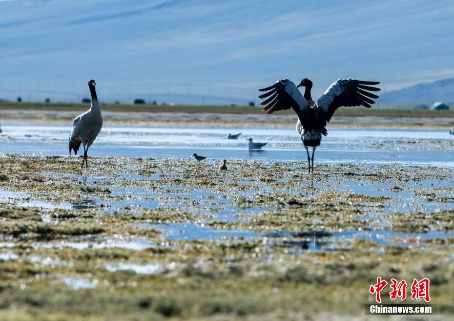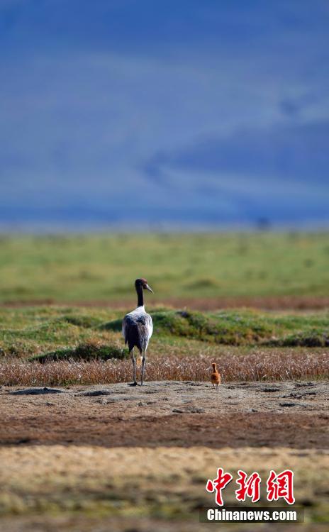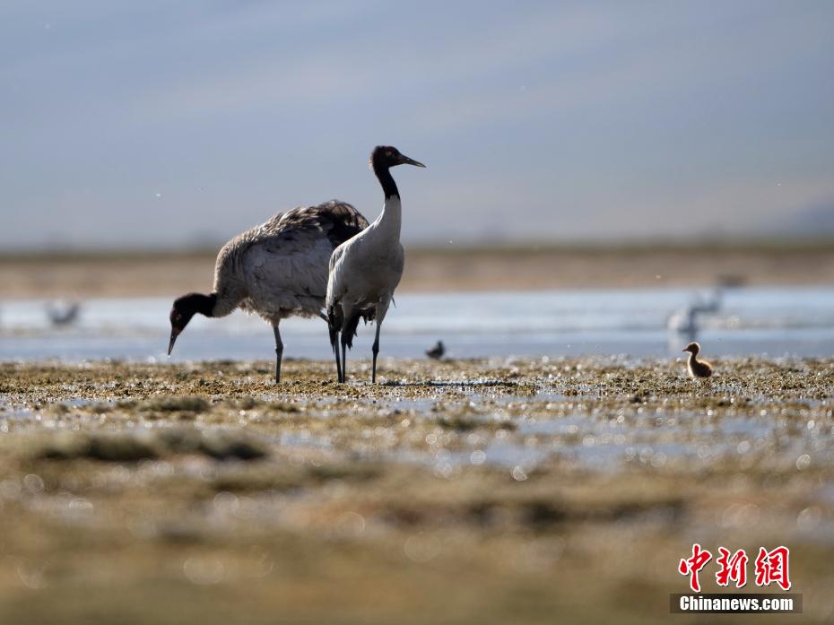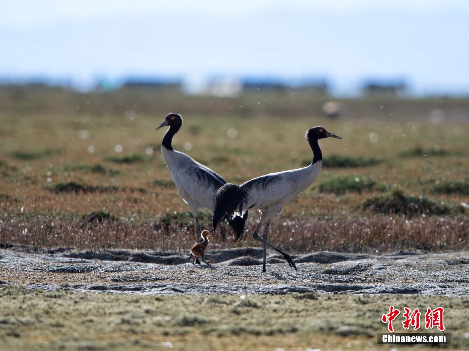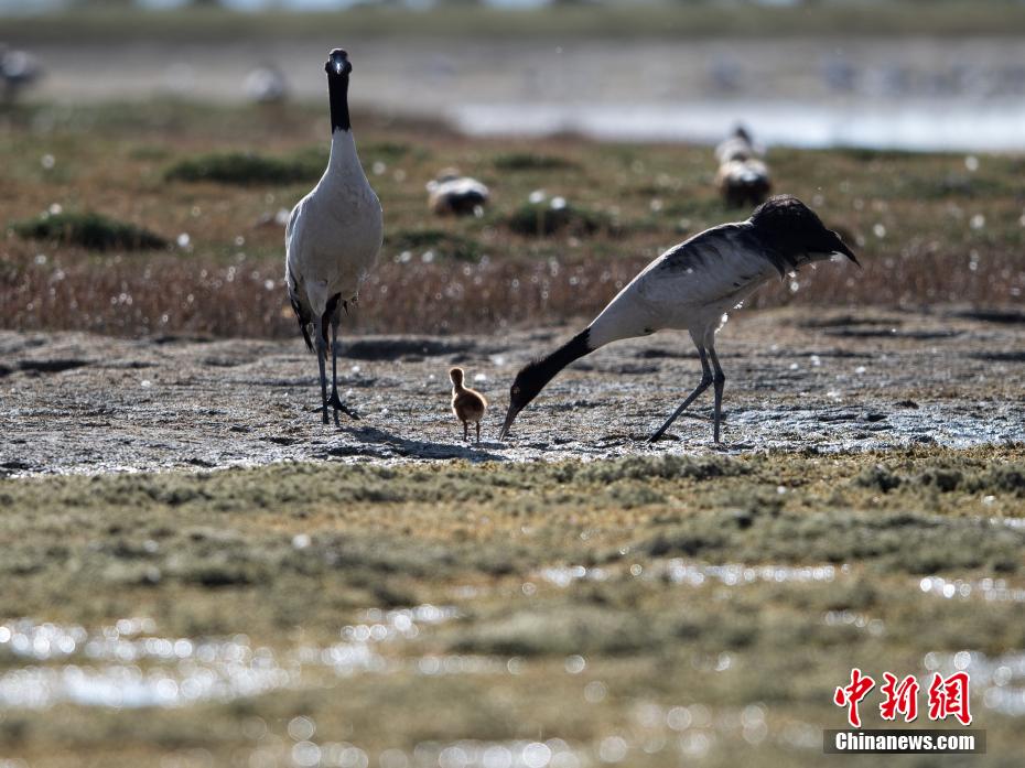 圖為(wei) 黑頸鶴幼崽在父母的引導下在濕地裏棲息、覓食。貢嘎來鬆 攝