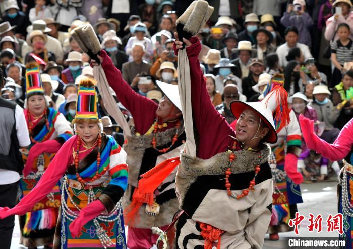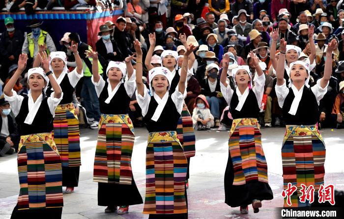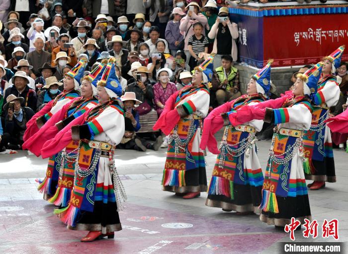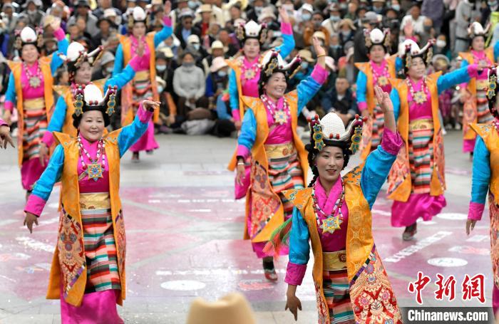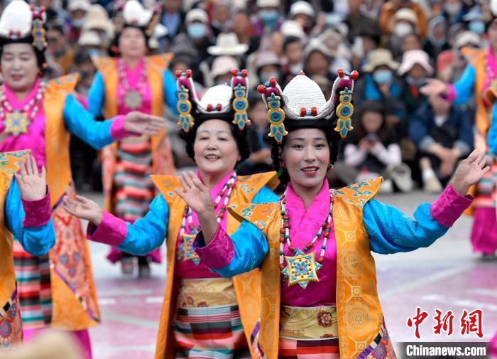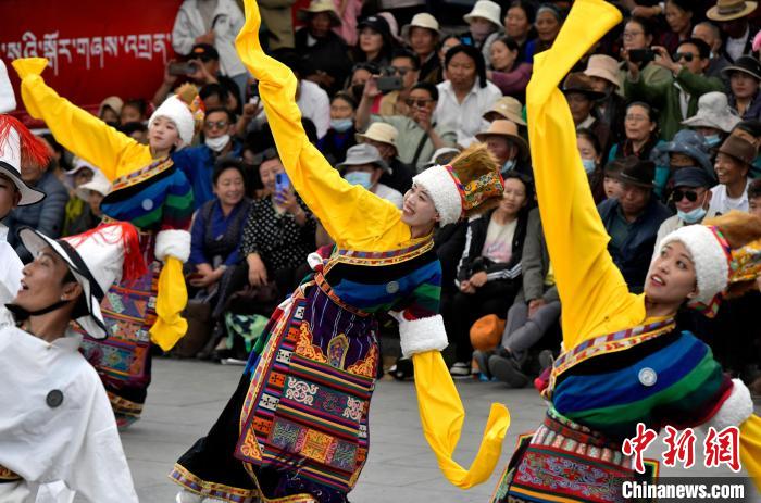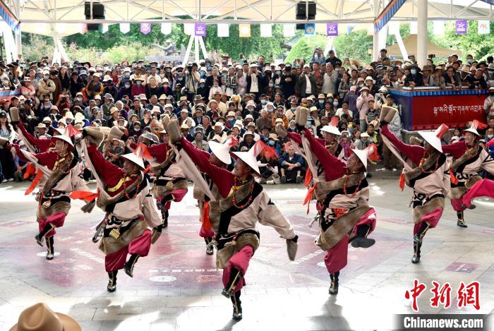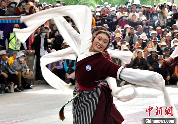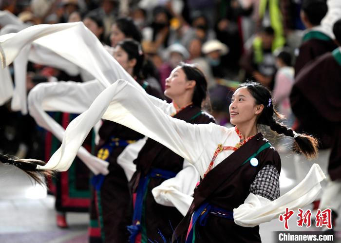 6月14日,第二屆拉薩鍋莊舞大賽決(jue) 賽在布達拉宮腳下的宗角祿康公園舉(ju) 辦,共有12支隊伍參賽。圖為(wei) 鍋莊舞大賽決(jue) 賽現場。中新社記者 李林 攝